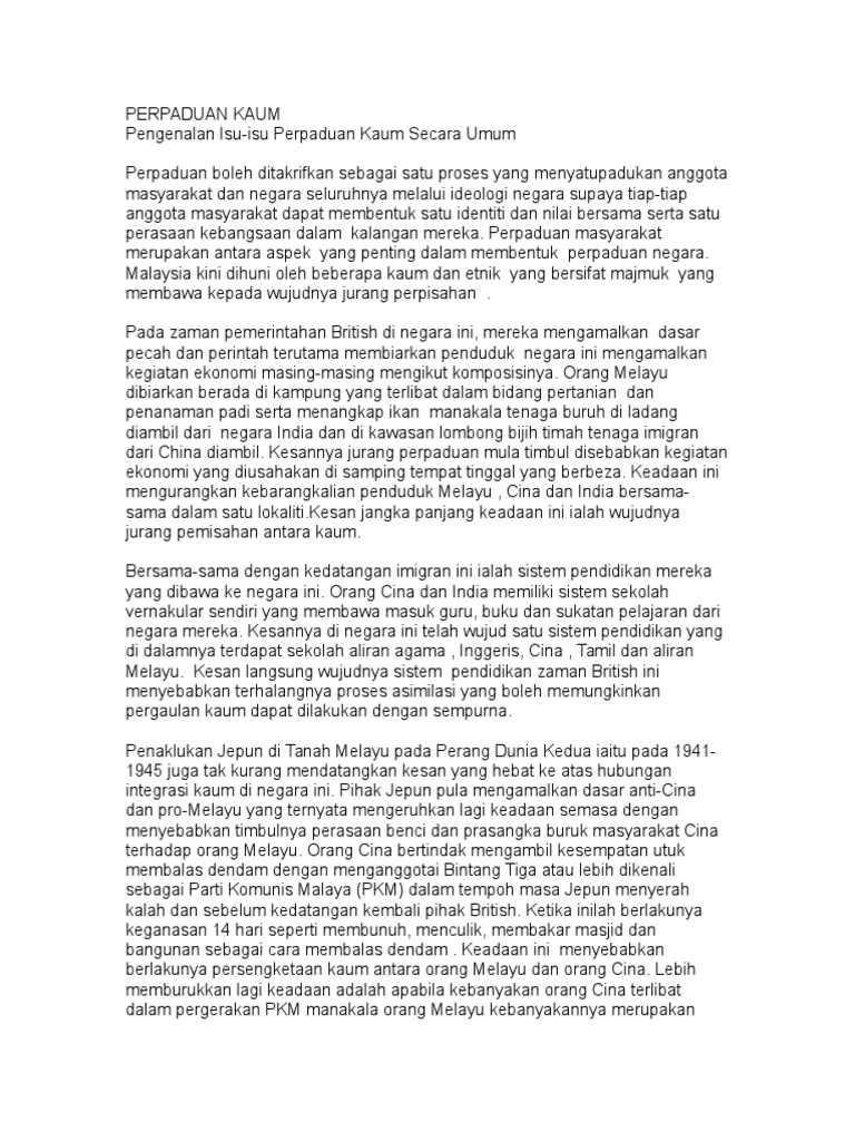 Sebagai rakyat malaysia, pasti kita sudah tidak asing lagi dengan wujudnya masyarakat berbilang kaum di negara kita seperti cina,melayu,india,kadazan dan sebagainya. Strategi memperkukuh hubungan kaum di malaysia. Ia merupakan rusuhan kaum yang berlaku akibat pilihan raya umum pada tahun yang sama dan kemuncak bagi masalah perpaduan di negara kita. Pengenalan satu system pendidikan bercorak kebangsaan yang merupakan wadah untuk mengeratkan hubungan antara kaum. Implikasi ketidakwujudan perpaduan kaum dan integrasi nasional di malaysia. Perpaduan kaum dapat meningkatkan semangat patriotisme dalam kalangan pelajar. Malaysia terkenal di persada dunia sebagai sebuah negara yang berbilang kaum dan bangsa yang bersatu padu. Perbezaan parti politik di malaysia yang berasaskan perkauman telah menyukarkan perpaduan kaum. Kesan penjajahan terhadap pembangunan fizikal dan sosial di tanah melayu serta hubungkaitnya dengan kemajuan negara malaysia pada hari ini. Contoh karangan semangat kejiranan yang terbaik. Peristiwa hitam 13 mei 1969. Hari keluarga merupakan aktiviti yang sihat yang wajar menjadi kemestian sesebuah komuniti. Serangkap lagu satu malaysia di atas menunjukkan betapa pentingnya perpaduan kaum diamalkan oleh rakyat malaysia.